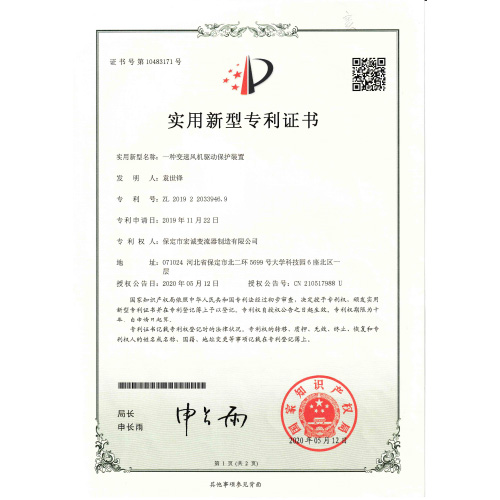 實(shí)用新型專利證書一種變速風(fēng)機(jī)驅(qū)動保護(hù)裝置