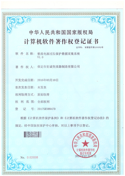 計(jì)算機(jī)軟件注冊(cè)權(quán)登記證書——整流電源過壓保護(hù)數(shù)據(jù)采集系統(tǒng)V1.0