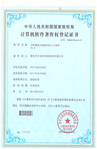 計(jì)算機(jī)軟件注冊(cè)權(quán)登記證書——IGBT模塊電源DSP嵌入式軟件V1.0