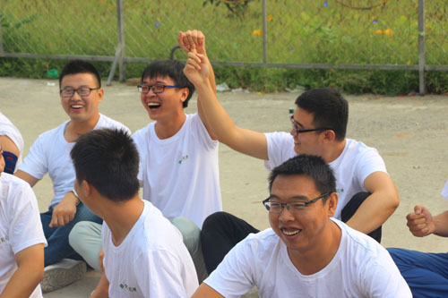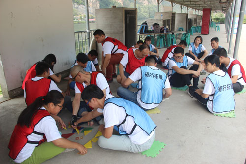 我們先進行了拓展前的熱身活動,兩個簡單的小游戲消除了大家彼此間的陌生感,活躍了氣氛。然后,大家被教練分成兩組,并被要求在半小時內選出隊長,取隊名,定口號,繪制隊旗,選定隊歌并擺出團隊造型。大家都集思廣益,分工合作,各顯其能。